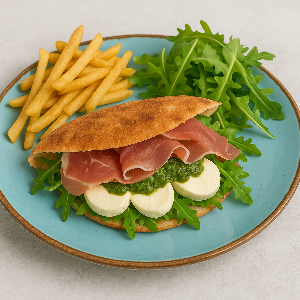 μοτσαρέλα (Bufala), προσούτο, φρέσκια ρόκα και πέστο genovese
